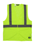 4 oz., polyester mesh; 2" reflective tape; ANSI/ISEA 107-2015 Type R Class 2 Certified; Hook/loop front closure; Adjustable snaps on side seam; Banded armholes, neck opening, and waist;